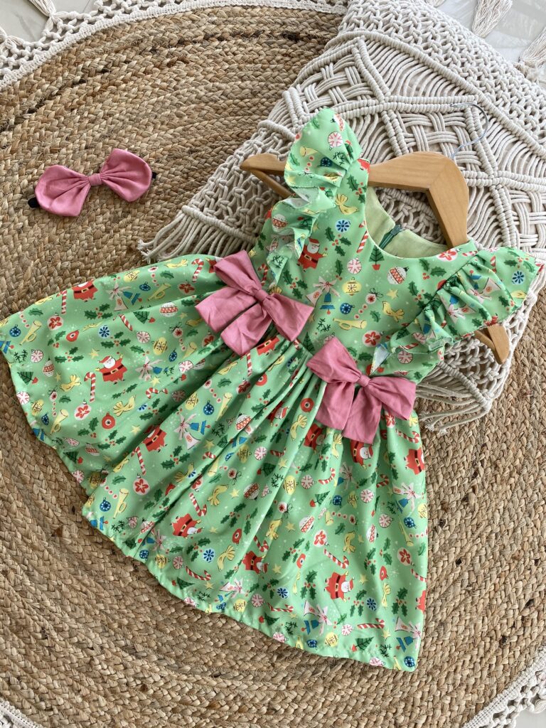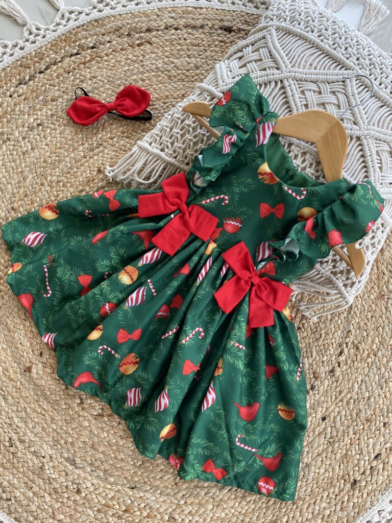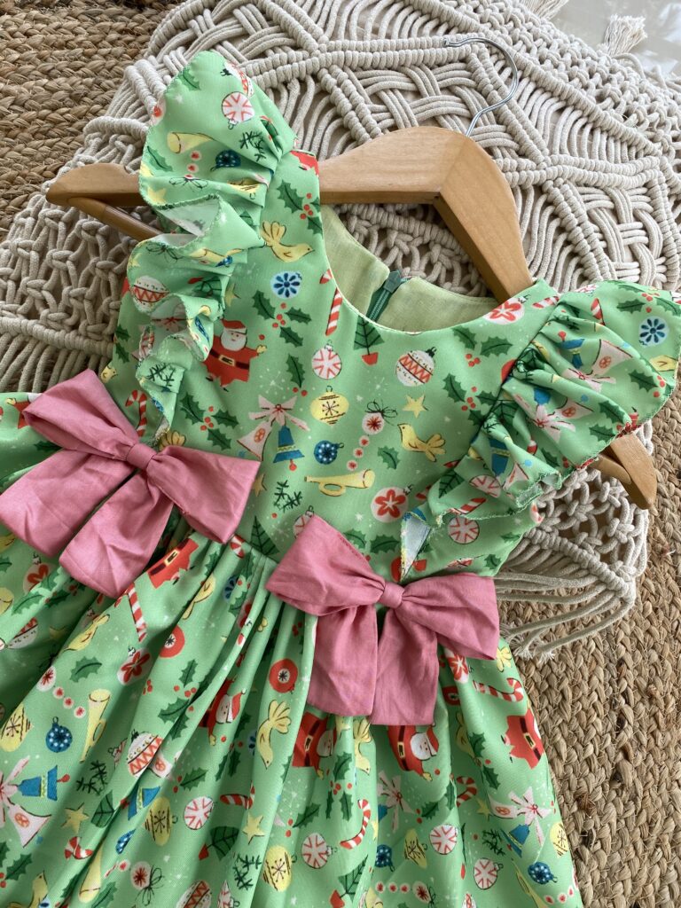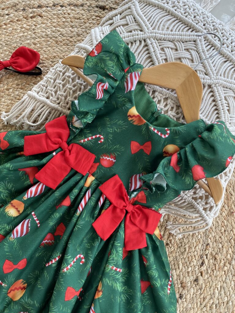 Christmas themed green Cambridge cotton frock