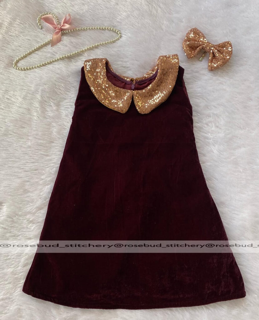 Maroon velvet Aline frock with peterpan collar
