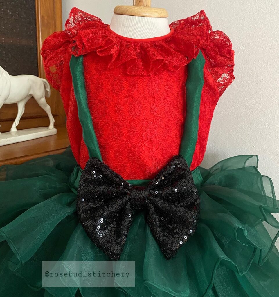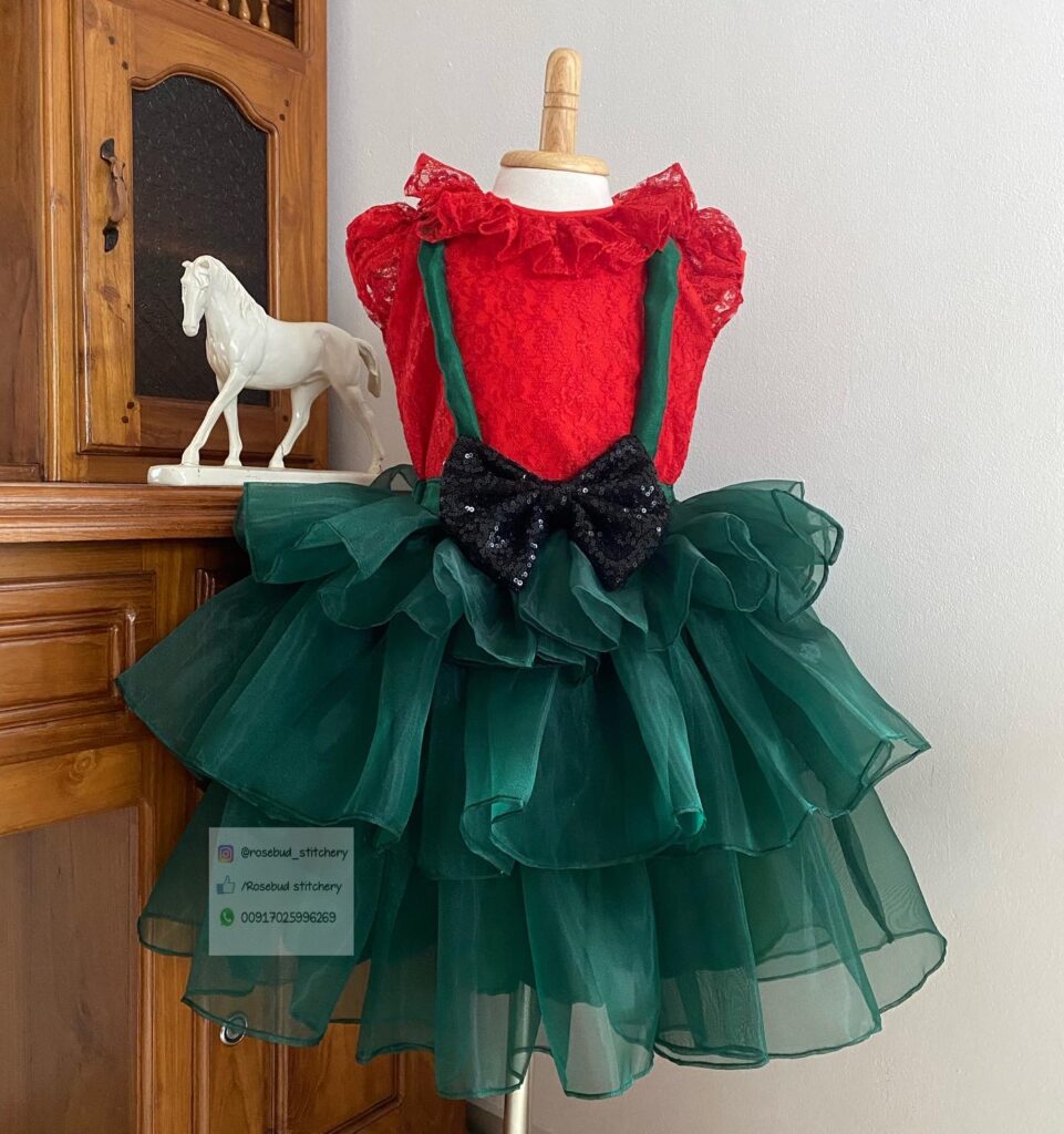 Green organza suspender skirt with red top