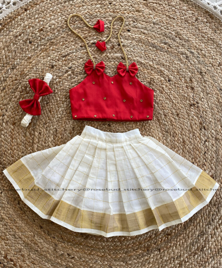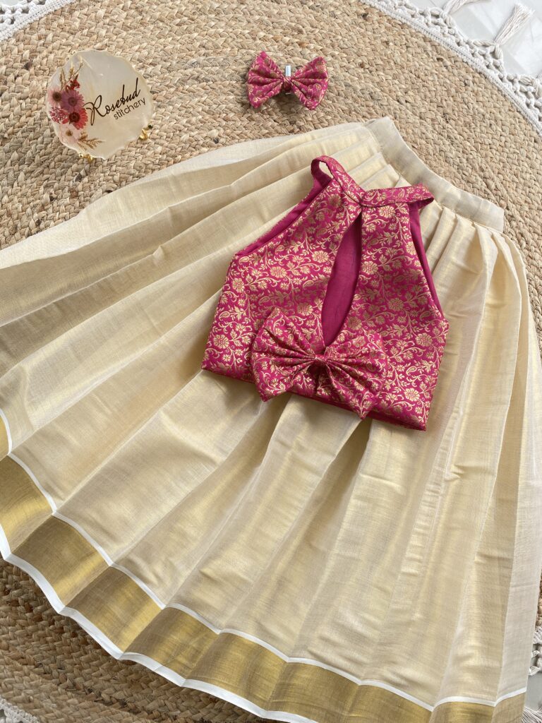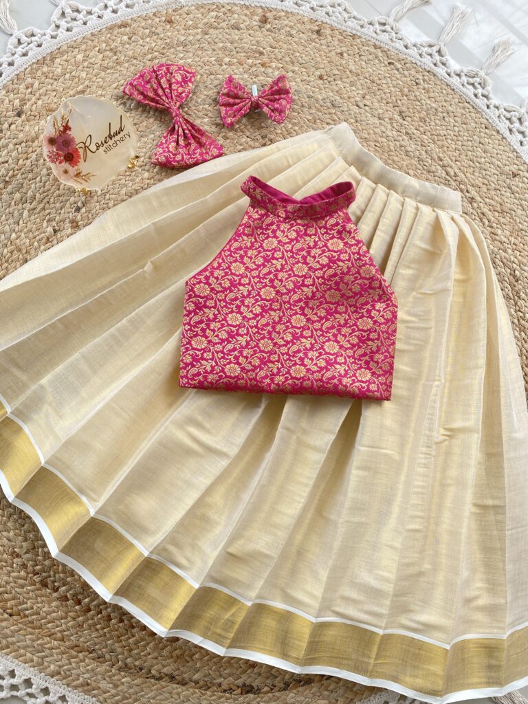 Kani Konna floral digital printed kasavu skirt with yellow taffeta silk top