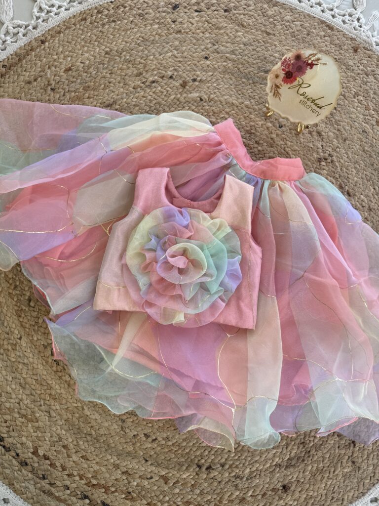Colorful layered frock in 3/4th length, silver sequence fabric collar and back bow
